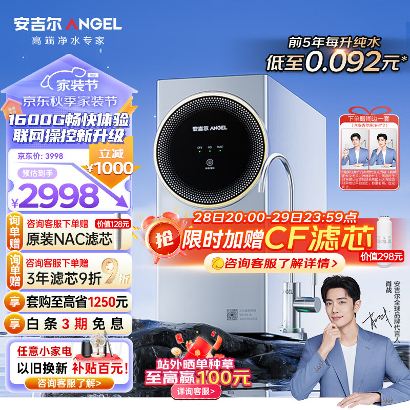 安吉尔【肖战代言】净水器家用排行前十名 1600G流速体验 E-Tech4200 5年RO反渗透厨下直饮机 4.24L/min价格:2998.00元!