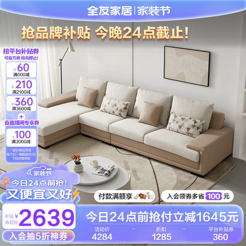 全友家居 现代简约布艺沙发家用大户型客厅实木架贵妃转角沙发102085价格:4284.29元!