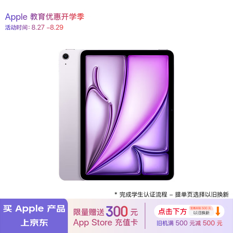 Apple/苹果【教育优惠】iPad Air 11英寸 M2芯片 2024年新款平板电脑(Air6/512G WLAN版/MUWP3CH/A)紫色价格:6899.00元!