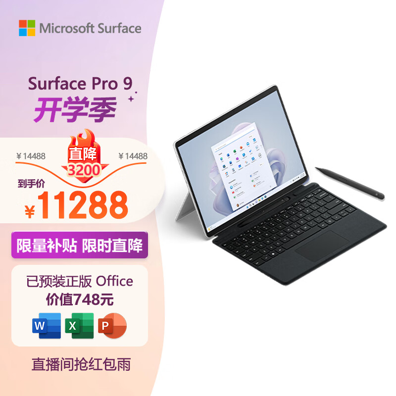 微软Surface Pro 9 亮铂金+典雅黑带触控笔键盘盖i7 16G+256G 二合一学生平板13英寸120Hz触控屏办公本价格:11288.00元!