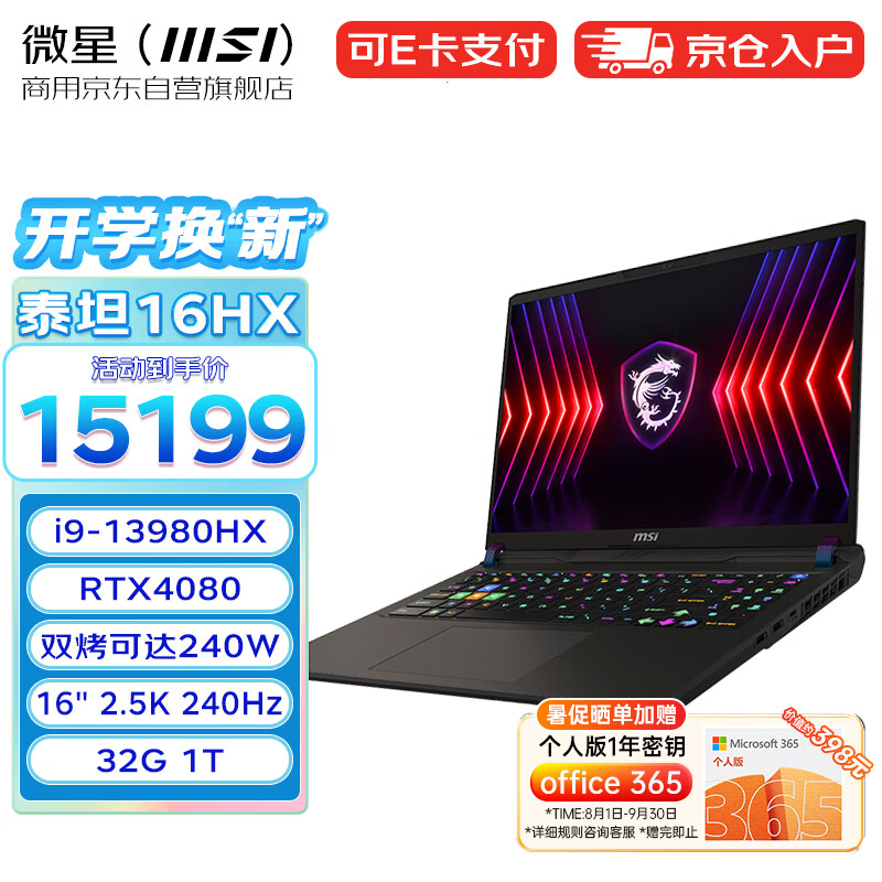微星(MSI)泰坦16HX 酷睿i9 16英寸设计剪辑办公笔记本电脑(i9-13980HX 32G 1T RTX4080 2.5K 240Hz)定制价格:15199.00元!