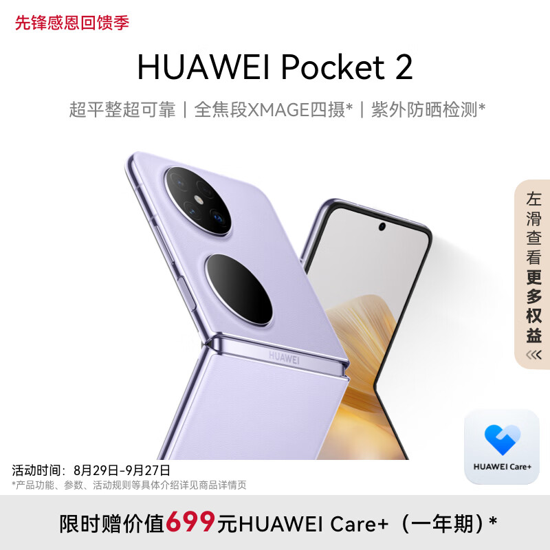 HUAWEI Pocket 2 超平整超可靠 全焦段XMAGE四摄 12GB+256GB 芋紫 华为折叠屏鸿蒙手机价格:7499.00元!