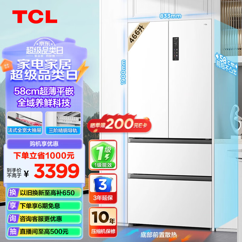 TCL 466升T9超薄平嵌法式四开门58cm嵌入式白色家用电冰箱风冷无霜一级能效大容量双循环R466T9-DQ价格:3899.00元!