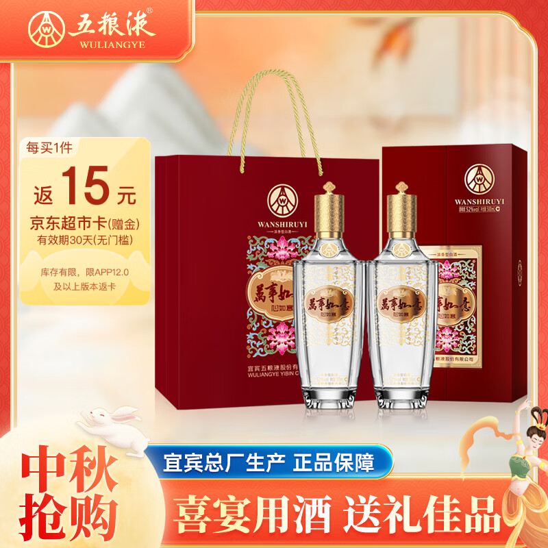 五粮液 中秋送礼 万事如意心如意 固态法浓香型白酒52度500ml*2瓶价格:748.00元!
