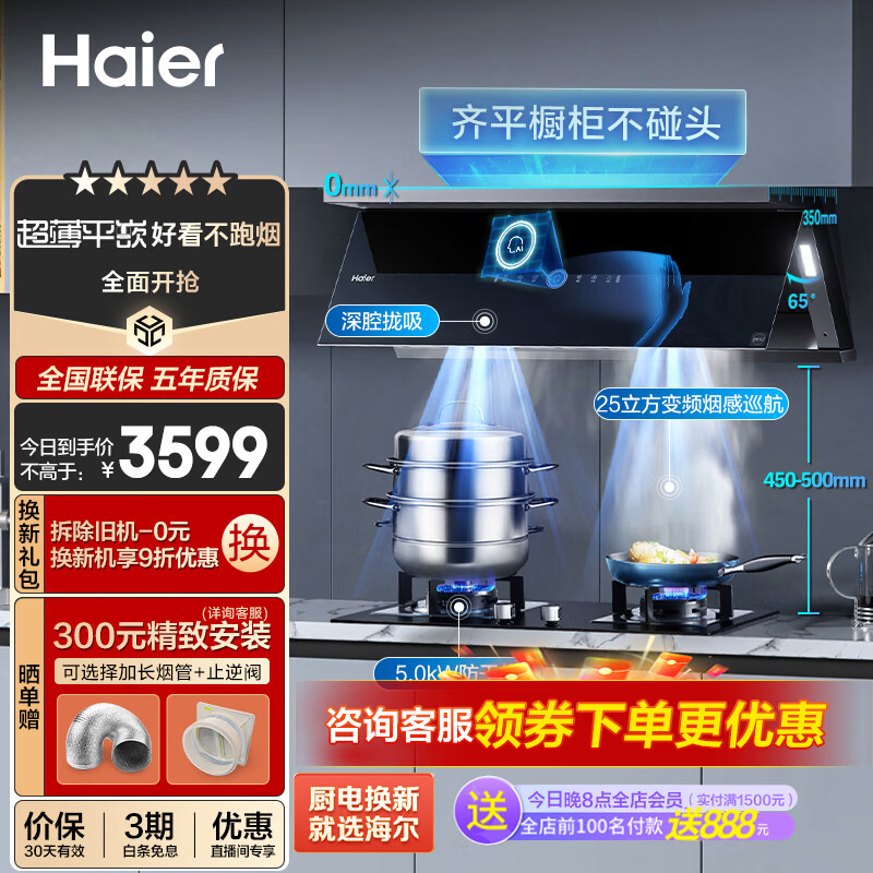 海尔(Haier)抽油烟机 超薄近吸烟灶套装 25m3/min变频有效风顶侧双吸外观 家用吸油烟机燃气灶具C21U1+QE9B1天价格:3599.00元!