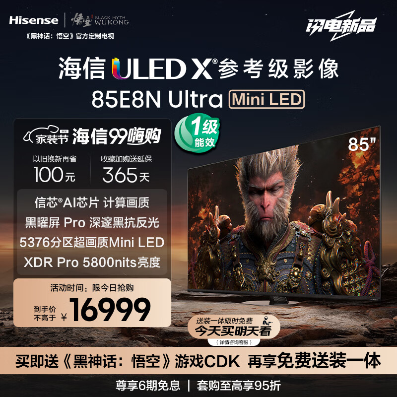 海信电视 85E8N Ultra85英寸黑神话悟空游戏ULED超画质5376分区Mini LED超薄大屏北京以旧换新一级能效价格:16999.00元!