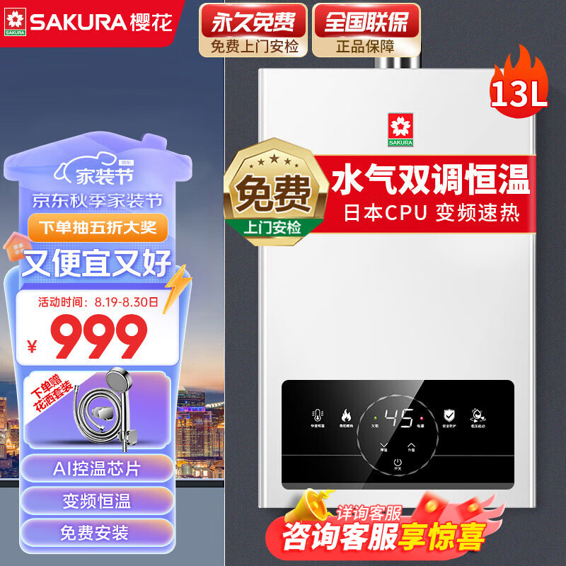 樱花(SAKURA)燃气热水器水气双调智能精控恒温直流变频降噪触控强排式热水器低压启动多重防护 13L NJP007S天然气价格:1299.00元!