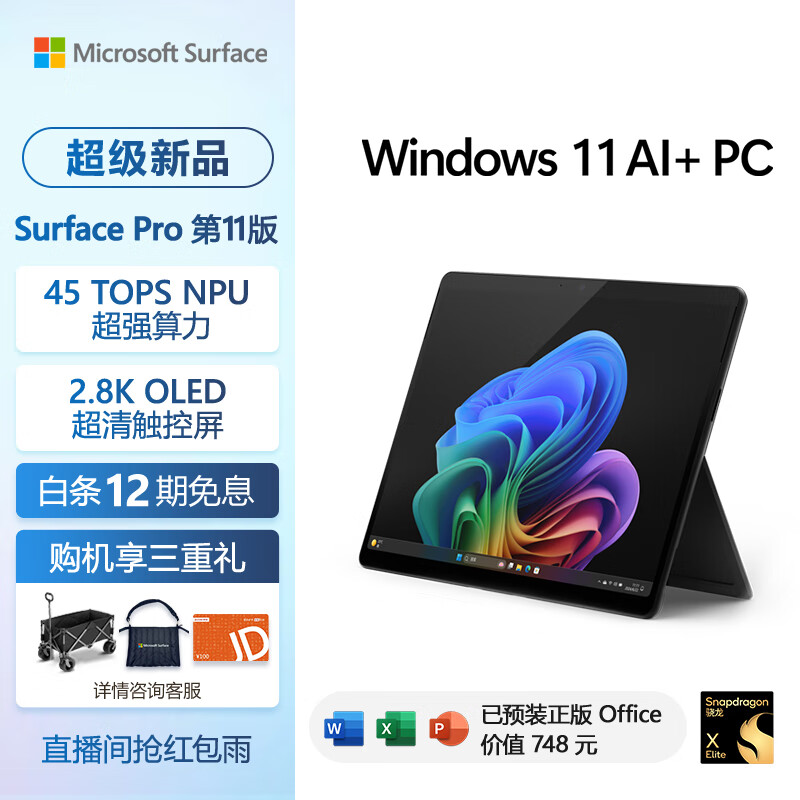 微软(Microsoft)全新Surface Pro第11版 骁龙X Elite 16G 1T 典雅黑二合一平板笔记本电脑 学生平板 AIPC Pro 11价格:13288.00元!