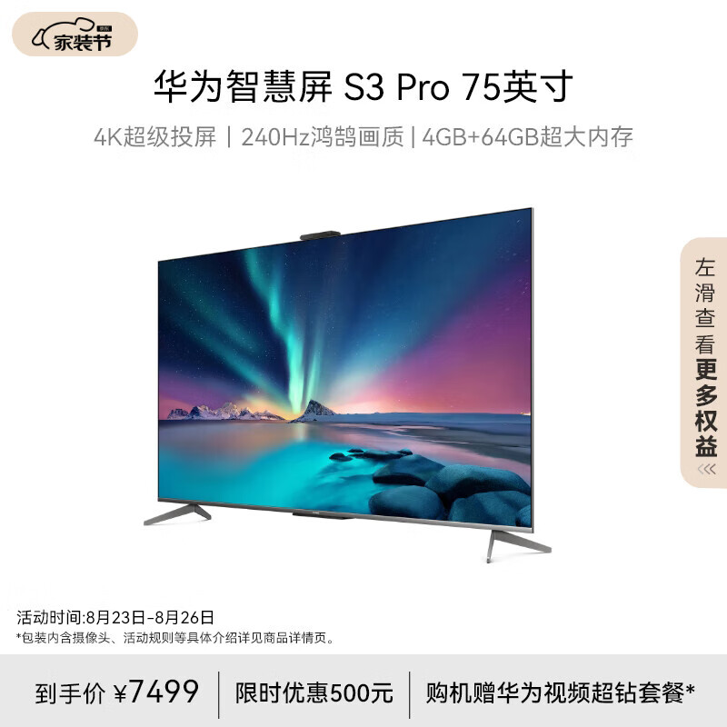 华为智慧屏 S3 Pro 75英寸 4K超级投屏 240Hz高刷超高清 智能液晶超薄游戏大内存平板电视机HD75AJMS价格:7499.00元!