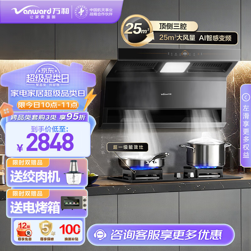 万和(Vanward)顶侧双吸1000Pa三腔直流变频家用抽油烟机 燃气灶具烟灶套装 25m3/min大吸力 WL860+G8L90(天然气)价格:2848.00元!