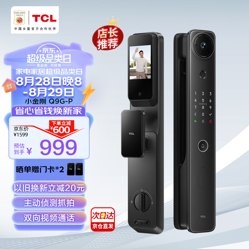 TCL双向视频大屏猫眼锁Q9G-P智能锁指纹锁密码锁全自动门锁防盗门锁价格:1599.00元!