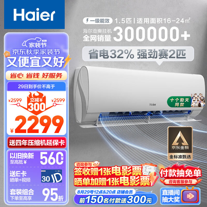 海尔(Haier)劲爽 1.5匹新一级能效变频省电节能 冷暖 卧室壁挂式空调挂机 KFR-35GW/B5LAA81U1以旧换新价格:2299.00元!