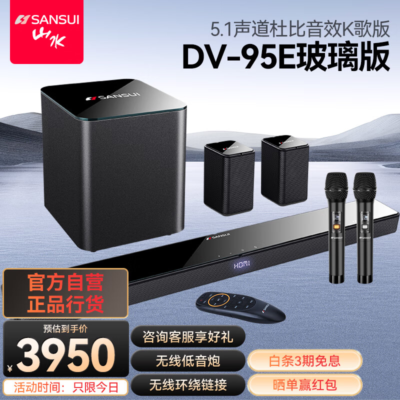 山水(SANSUI)DV-95E杜比音效回音壁 5.1声道家庭影院 家庭KTV套装音响Soundbar家用电视K歌卡拉OK 带麦克风价格:3950.00元!