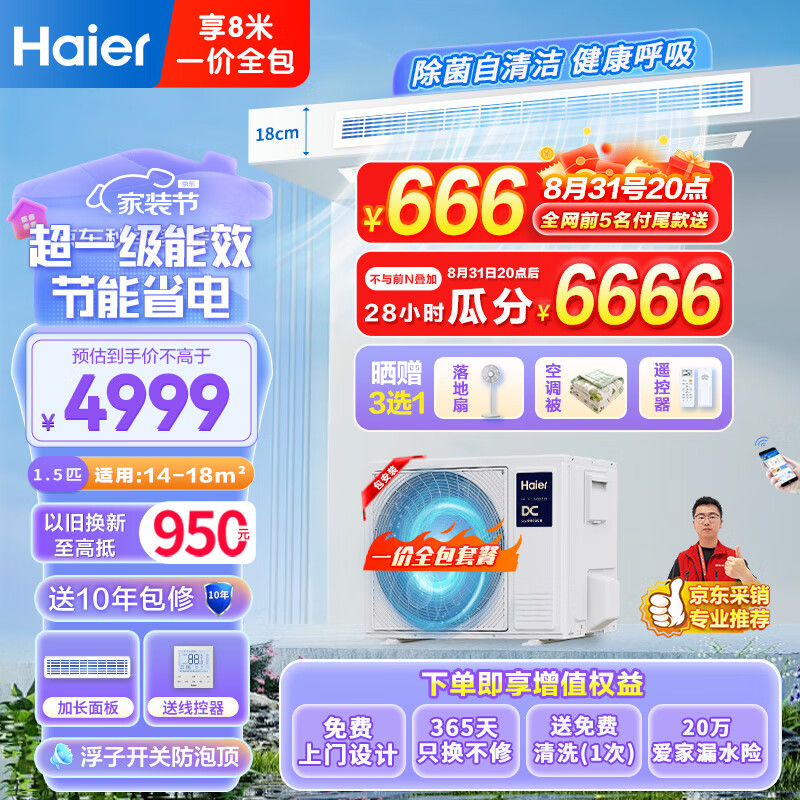 海尔(Haier)中央空调风管机一拖一 1.5匹新一级能效 卧室嵌入式空调 云舒 一价全包 KFRd-35NW/70EAD81价格:4968.00元!
