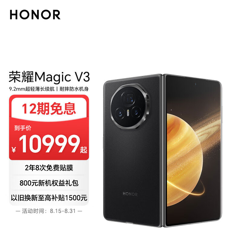 荣耀Magic V3 新款折叠屏 超轻薄长续航 耐摔防水机身 第三代骁龙8 16+1TB 绒黑色 拍照 5G AI智能手机价格:10999.00元!