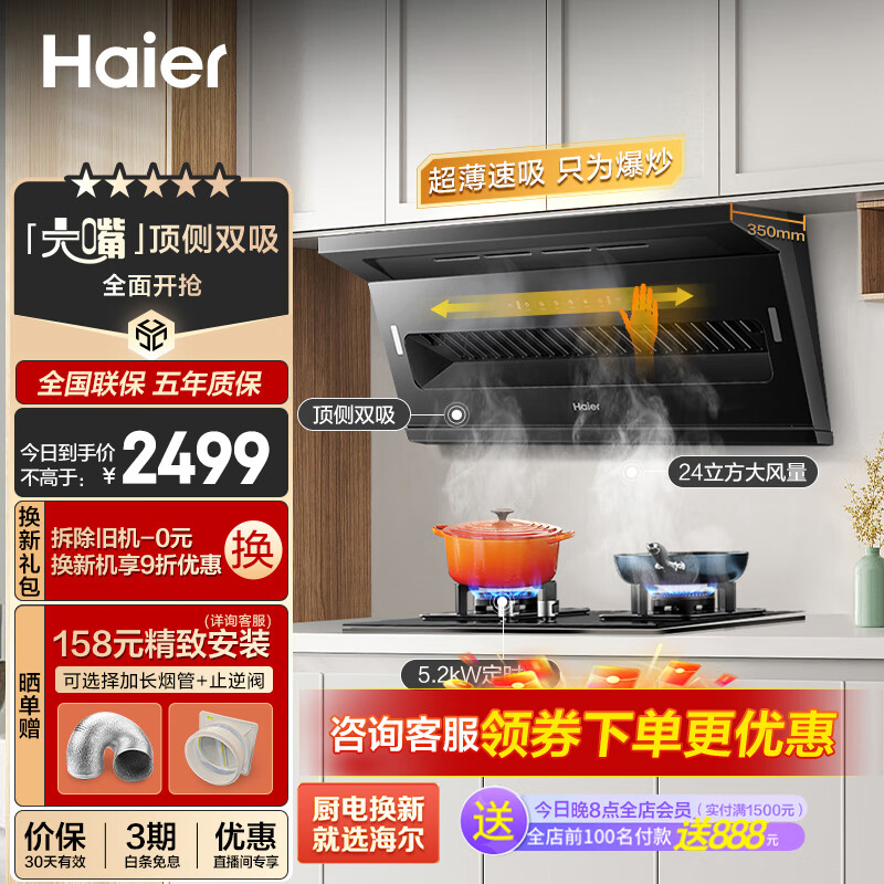 海尔(Haier)抽油烟机顶侧双吸 24m3/min大吸力 挥手智控 7字型家用厨房吸油烟机套装 齐平橱柜C51+Q2BE7天价格:2499.00元!