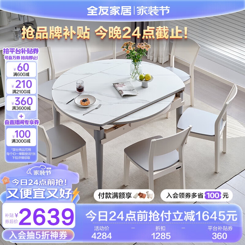 全友家居 可伸缩折叠岩板餐桌现代简约餐桌椅组合家用吃饭桌子DW1028价格:4284.29元!