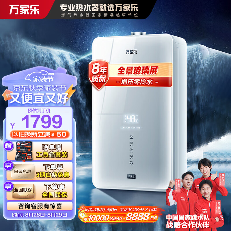 万家乐 16升零冷水燃气热水器(天然气)增压大水量玻璃屏智能防冻三巡航模式以旧换新JSQ30-16D10S价格:1799.00元!