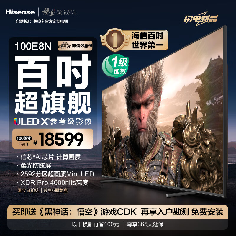海信电视100E8N 100英寸ULED超画质2592分区Mini LED超薄大屏 黑神话悟空游戏 北京以旧换新一级能效价格:18599.00元!