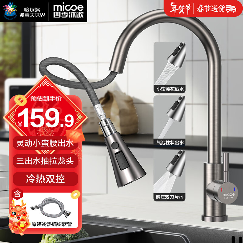 四季沐歌(MICOE)厨房水龙头 洗菜盆冷热抽拉式三功能不锈钢小蛮腰枪灰水槽龙头价格:199.90元!