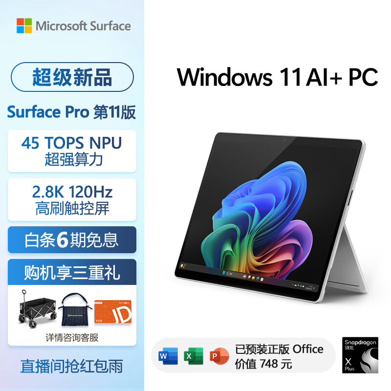 微软(Microsoft)全新Surface Pro第11版 骁龙X Plus 16G 256G 亮铂金二合一平板笔记本电脑 学生平板 AIPC Pro 11价格:8688.00元!