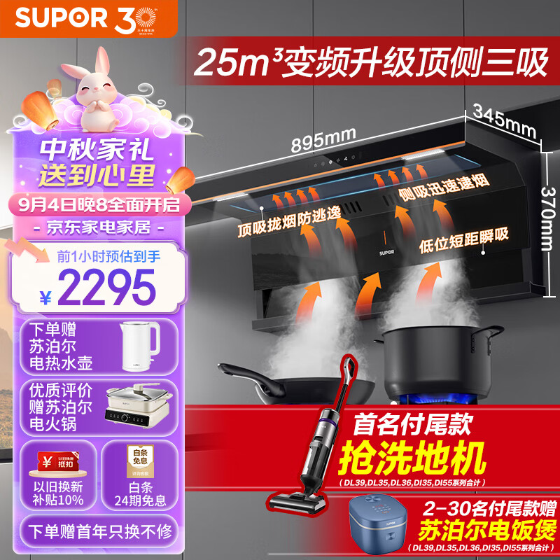 苏泊尔(SUPOR)抽油烟机 双腔拢烟顶侧双吸油烟机灶具套装 25立方大吸力变频烟灶 家用油烟机燃气灶 DL35+DB27液价格:2395.00元!