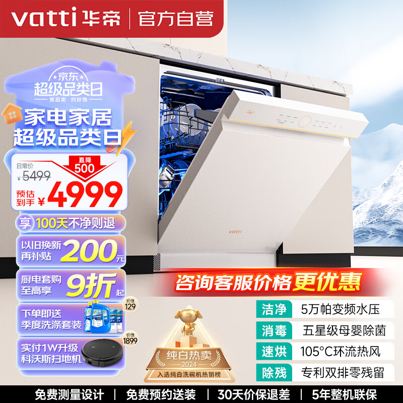 华帝(VATTI)15套嵌入式白色洗碗机 5万Pa变频高水压 五除菌一级水效 家用105℃烘干分层洗 白月光系列iQ15价格:5499.00元!
