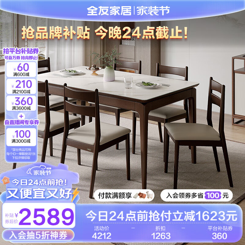 全友家居 新中式实木框架餐桌椅组合家用客餐厅吃饭桌家具全套129706价格:4212.86元!