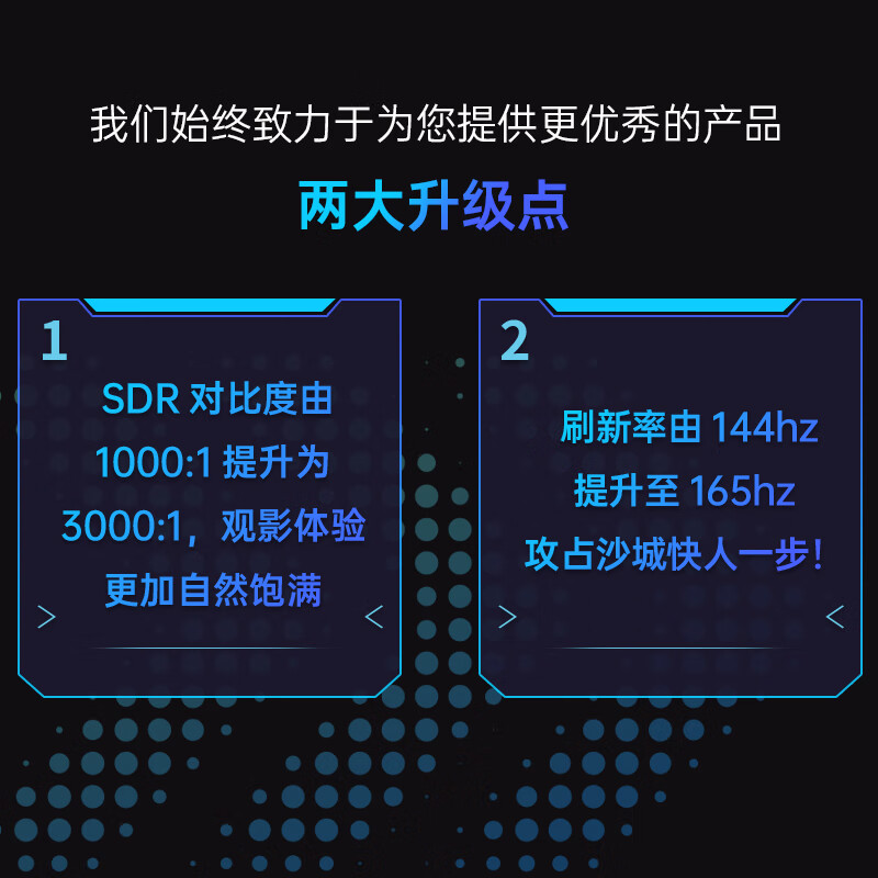 5、4K加160HZ直接起飞了,太丝滑了还是完美屏漏光正常,和原来用的4K显示屏对比色彩好很多,就是之前用的4K是60HZ的,换后丝滑起飞了,一千多超级性价比