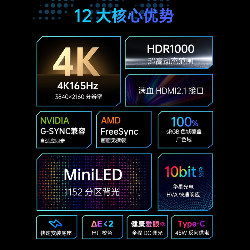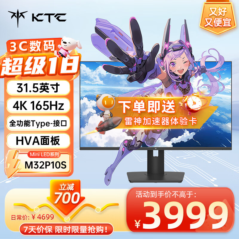 KTC 31.5英寸4K165Hz MiniLED 广色域 10bit 护眼显示屏 4608灯珠旋转升降HDR1000 电脑显示器M32P10S价格:4499.00元!