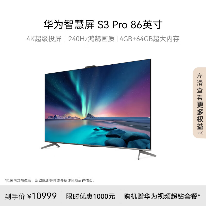 华为智慧屏 S3 Pro 86英寸 4K超级投屏 240Hz高刷超高清 智能液晶超薄游戏大内存平板电视机HD86AJMS价格:10999.00元!