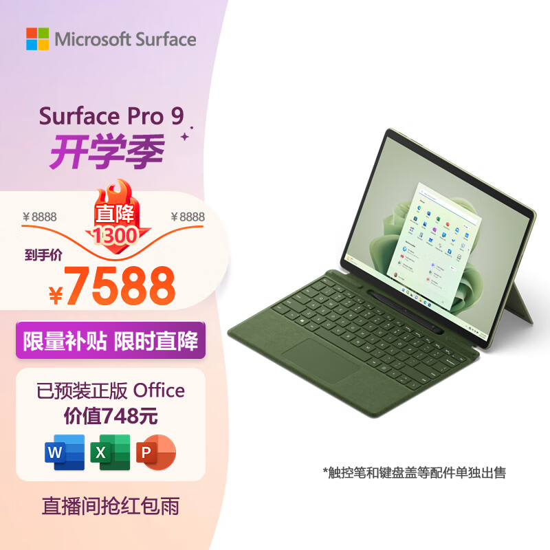微软Surface Pro 9 二合一平板电脑 i5/8G/256G 森野绿 13英寸高刷触控 学生平板 轻薄本 笔记本电脑价格:7588.00元!