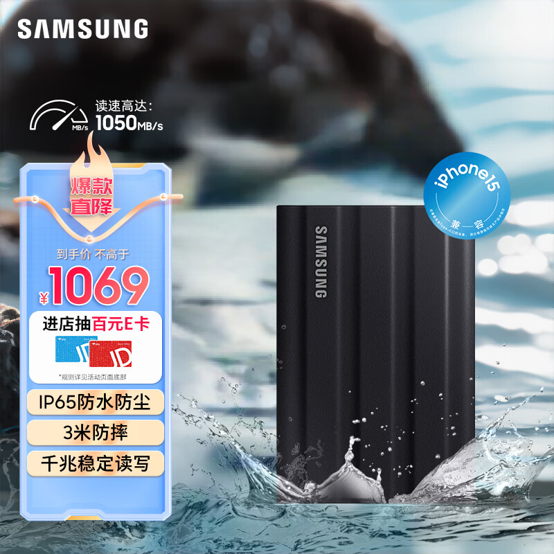三星(SAMSUNG)2TB Type-c接口 移动固态硬盘(PSSD)T7 Shield 暗夜黑 NVMe传输速度1050MB/s IP65三防保护价格:1069.00元!