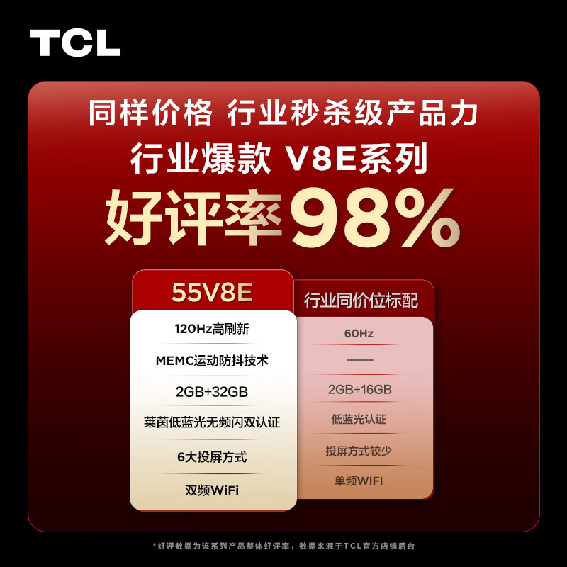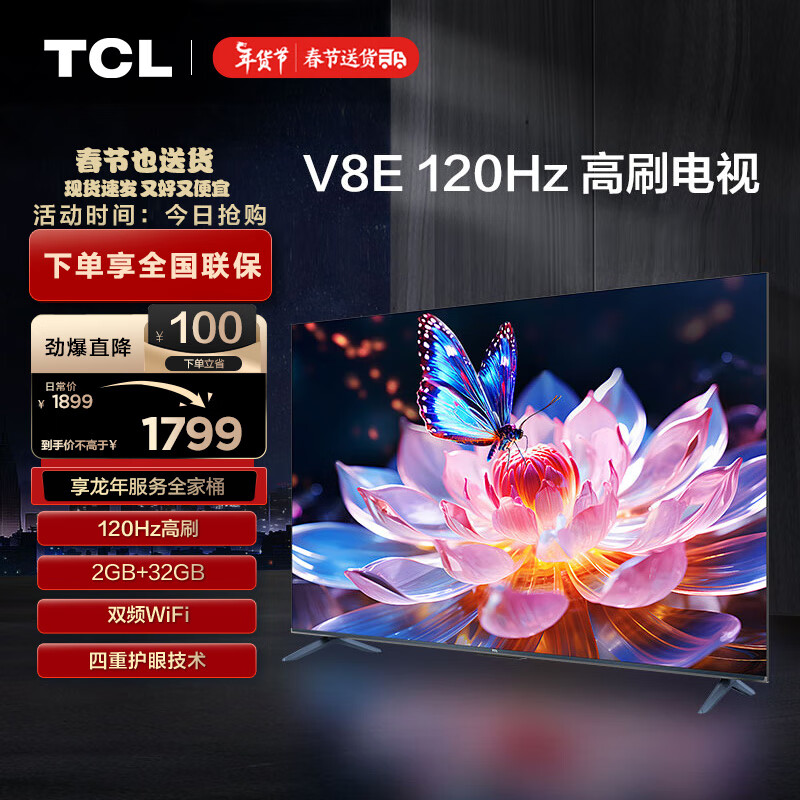 TCL电视 55V8E 55英寸 120Hz MEMC防抖 2+32GB 4K超高清 客厅家用液晶智能平板电视机 小电视价格:1799.00元!