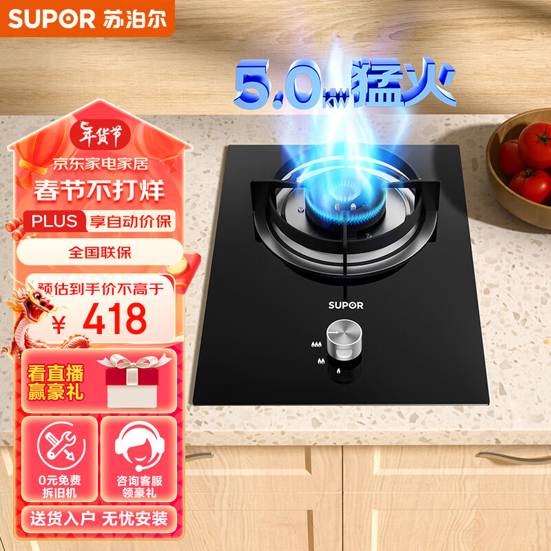 苏泊尔(SUPOR)燃气灶 液化气灶单灶具5.0kW大火力 钢化玻璃单眼灶嵌入式 台嵌两用 JZY-QB301液价格:418.00元!