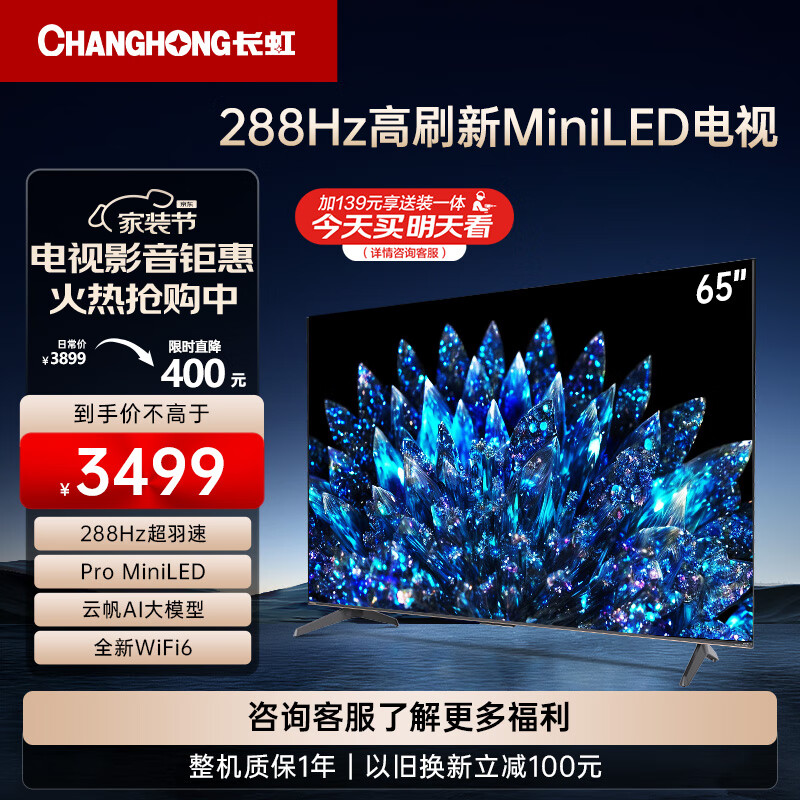 长虹电视65D8 MAX 65英寸288HzMiniLED游戏电视 4+64GB 4K超高清智能平板液晶LED电视机以旧换新价格:3499.00元!