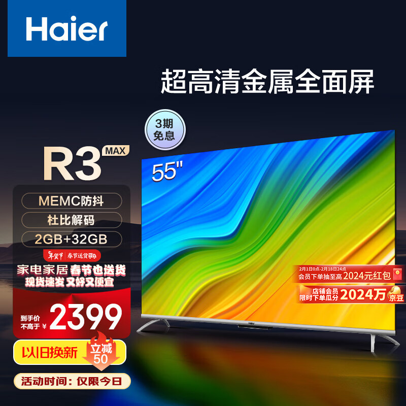 海尔(Haier)55R3-MAX 55英寸超薄金属屏电视 MEMC防抖 远场语音 4K超高清 2+32G大内存智能液晶电视价格:2399.00元!