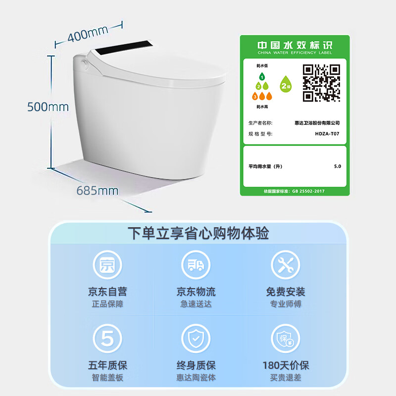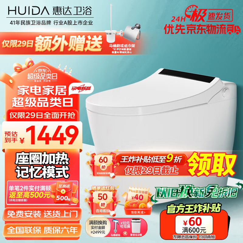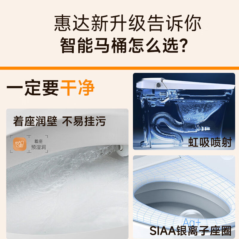 惠达(HUIDA)智能马桶座圈加热离座冲水一体超漩虹吸式坐便器T07 305坑距价格:2900.40元!