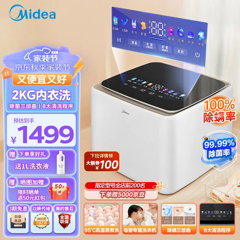 美的(Midea)内衣洗衣机2KG全自动波轮 迷你内裤洗衣机小型高温蒸煮洗除菌净螨儿童婴儿内衣裤洗衣机MNB20-01W价格:1499.00元!