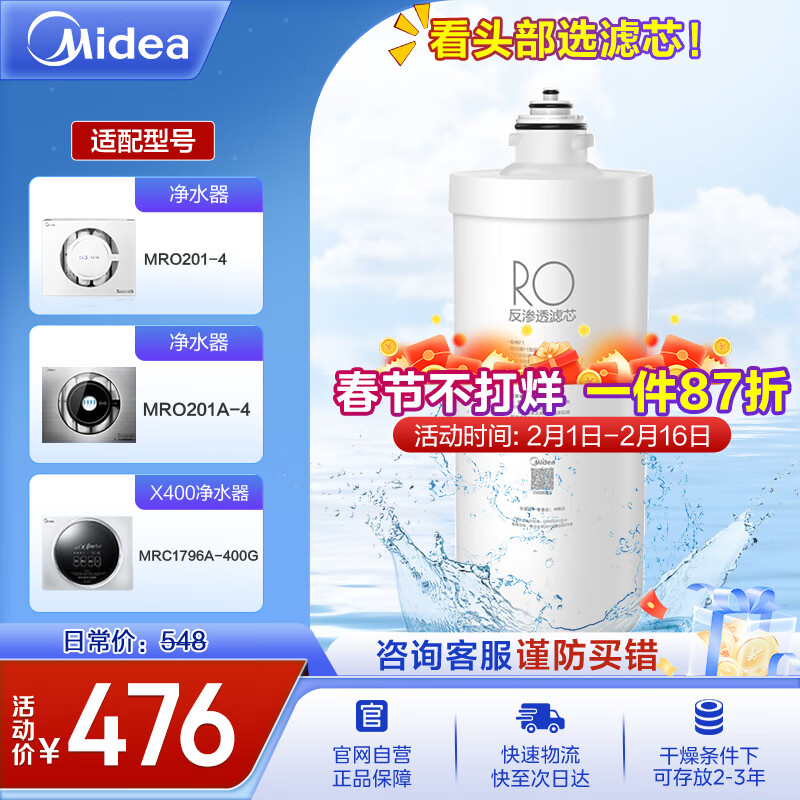 美的(Midea)净水器滤芯-适用于MRO201-4、MRO201A-4、1796A-400G MRC1698C-600G F1系列-200G RO反渗透滤芯价格:476.00元!