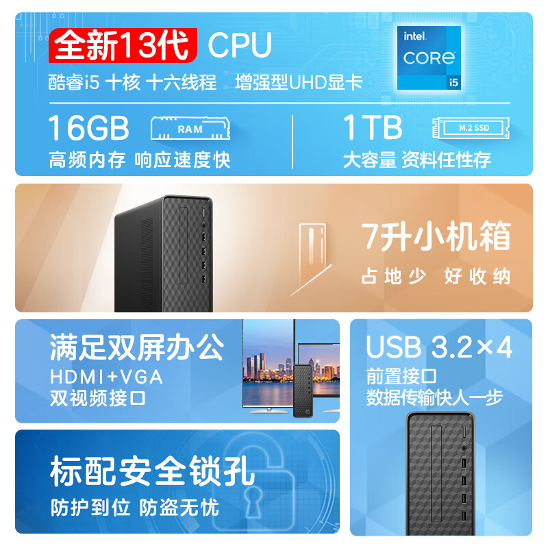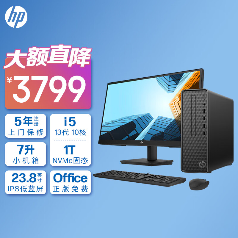 惠普HP 星Box商务办公台式电脑主机(13代i5-13400 16G 1TB大容量高速固态硬盘 WiFi 注册五年上门)+23.8英寸价格:3799.00元!