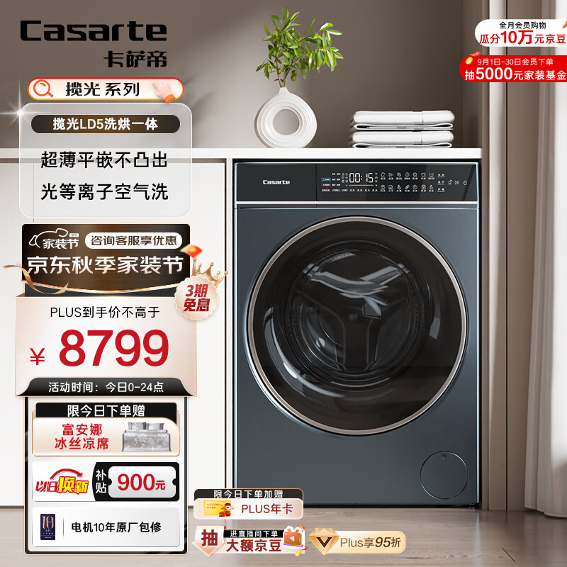 卡萨帝(Casarte)揽光LD5 滚筒洗衣机全自动家用 10公斤洗烘一体机 直驱变频 超薄大筒径平嵌 光等离子 HD10LD5ELU1价格:8799.00元!