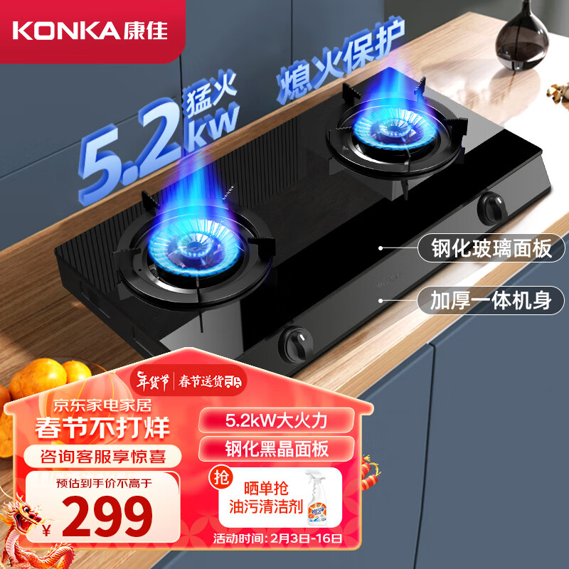 康佳(KONKA)灶具燃气灶双灶台灶 5.2kW猛火家用台式 天然气煤气灶 黑色玻璃面板炉具 JZT-T526Y(天然气)价格:299.00元!