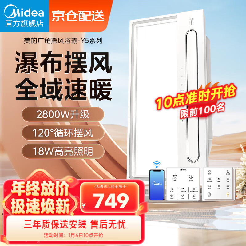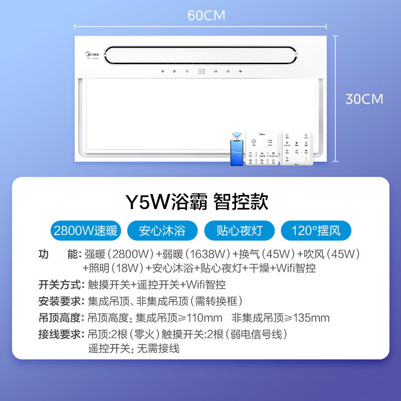 美的(Midea)浴霸灯暖风照明排气一体集成300x600速暖浴室智控取暖器吊顶Y5W价格:749.00元!
