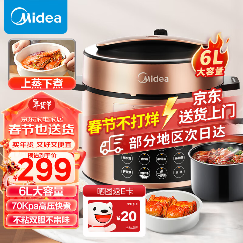 美的(Midea)提鲜系列电锅 6L全自动家用智能预约 上蒸下煮 不粘双胆煲汤炖肉YL60Q3-451电饭煲高压锅2-8人价格:329.00元!