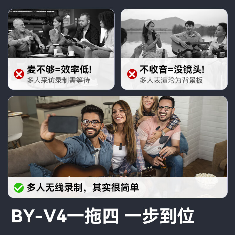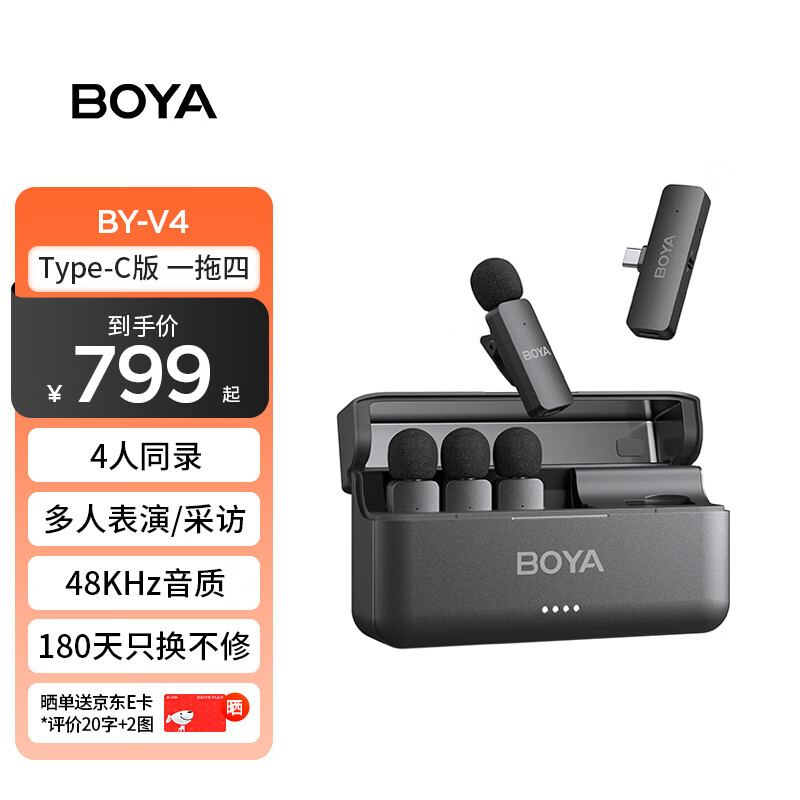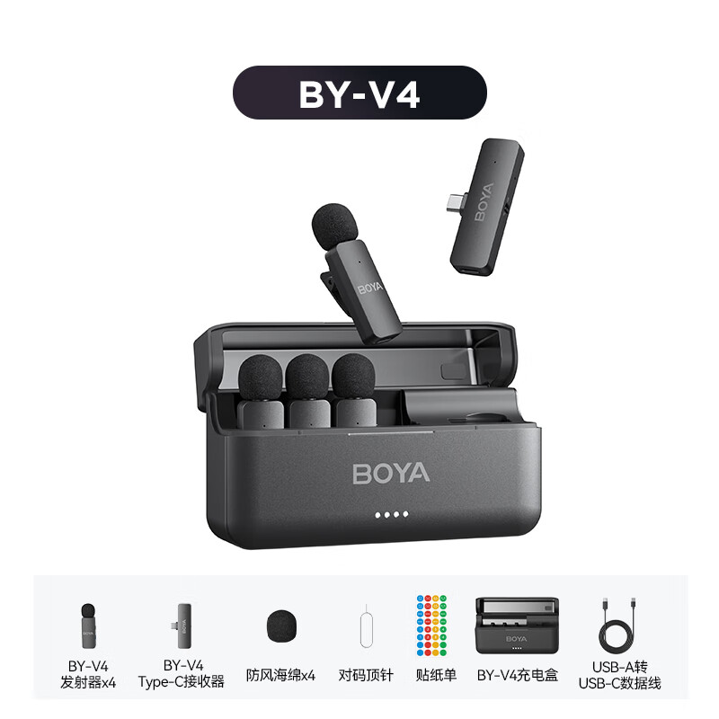 BOYA博雅麦克风BY-V4无线领夹麦克风一拖四 手机直播带货多人短视频收录音一拖多无线话筒Type-C版价格:940.00元!