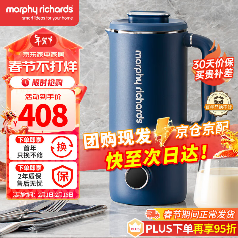 摩飞电器(Morphyrichards)豆浆机 家用破壁机 全自动清洗免过滤 低音降噪 多功能菜单可预约 600ml MR8200 蓝色价格:408.00元!