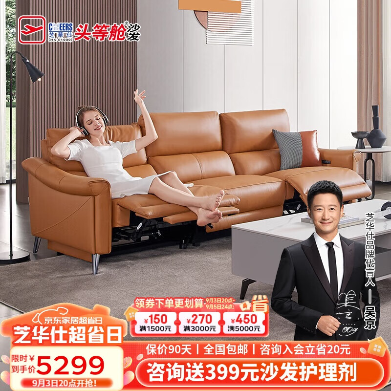 芝华仕(CHEERS)头等舱零靠墙简约真皮艺电动功能沙发客厅芝华士50611B橙意大三A价格:5299.00元!