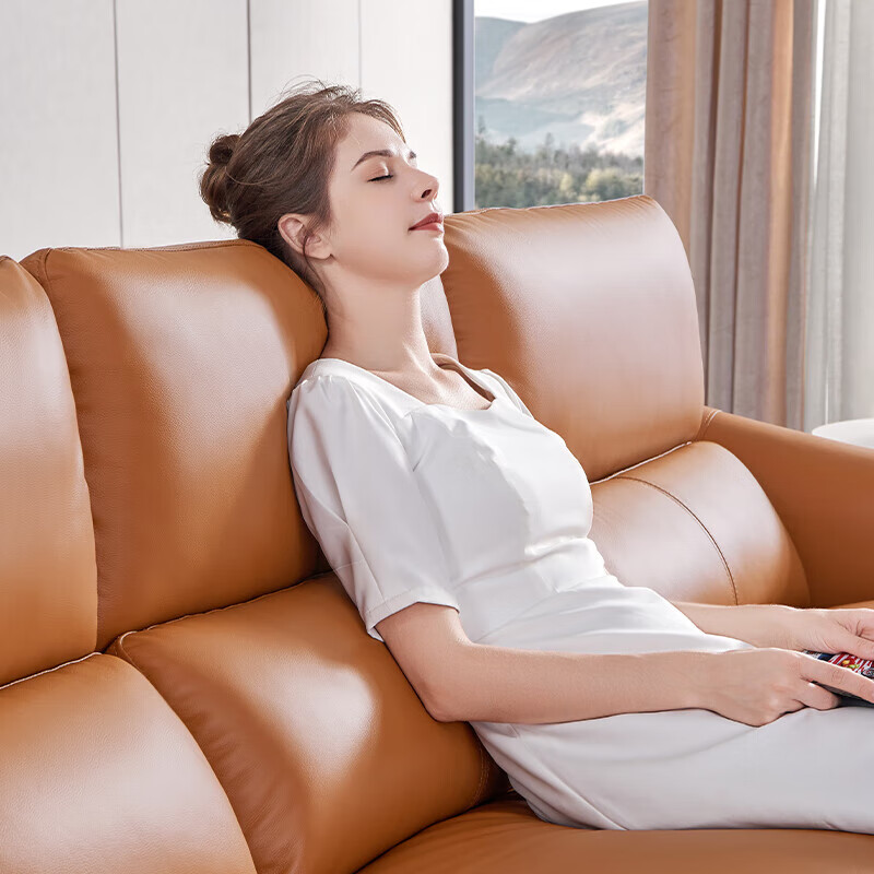 5、沙发收到了真皮的手感很好而且很好清洁坐着是以前布艺沙发不能比的选的是左右电动适合在家躺着看电视玩手机动动调节也很方便还有usb接口可以边玩手机边充电设计师很用心填充物也比较充实躺着软软的腰部支撑还不错