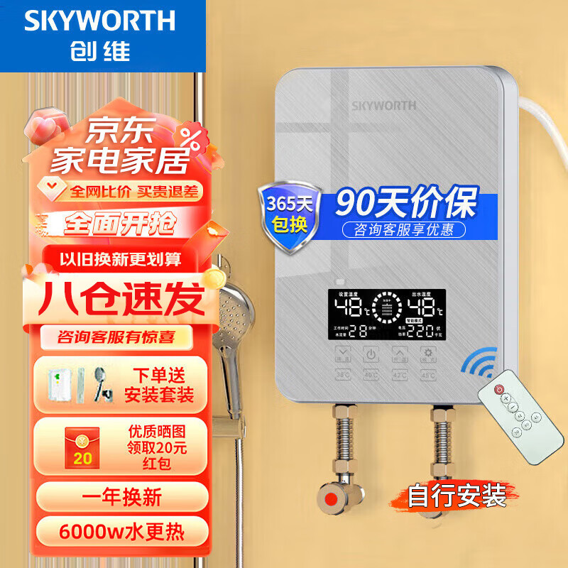 创维(Skyworth)即热式电热水器速热式小型恒温家用节能变频恒温洗澡机多功率可调D875拉丝银6000W价格:469.00元!